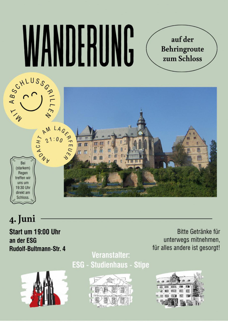 Zusammen mit den Studierenden von Studienhaus und Stipe wandern wir auf der Behringroute von der ESG zum Schloss. Dort wollen wir grillen und eine Abendandacht feiern (21:00 Uhr).