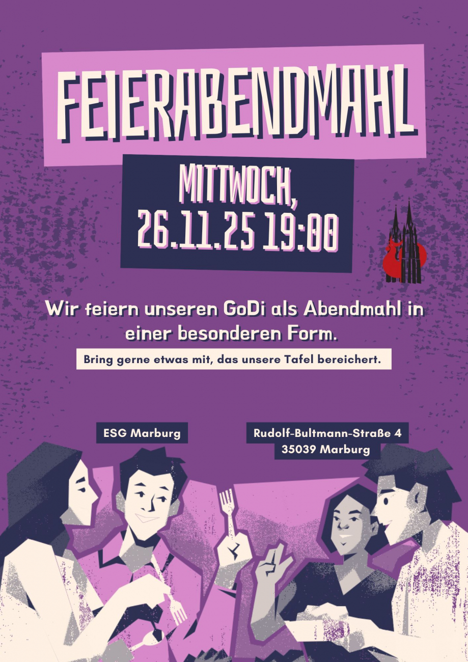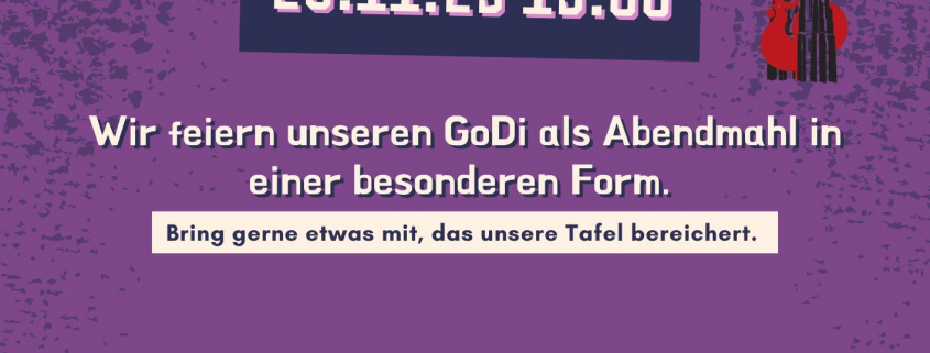 Wir feiern unseren Mittwochabendgottesdienst als Feierabendmahl, d.h. als Abendessen mit einer kleinen Liturgie, einen kleinem Impuls und musikalischer Begleitung.
