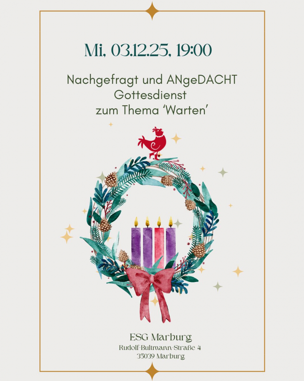 Der Gottesdienst unserer Reihe ‚Nachgefragt und ANgeDACHT‘ steht in der ersten Adventswoche unter dem Thema ‚Warten‘. Es spielt die ESG-Band.